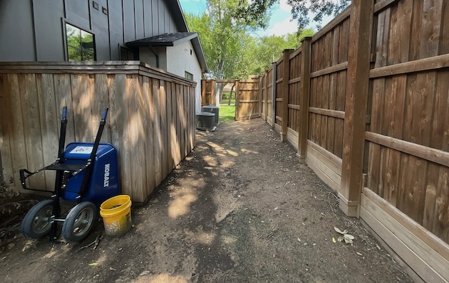 Start by identifying the low spots where water collects. Using a long level or laser level, regrade these areas so that surface runoff flows away from your foundation and not toward it. In many Dallas-area properties, the clay soil makes this even more important; when saturated, it expands and can push water back toward the structure. Maintaining a steady slope and firm compaction helps prevent this reverse flow.